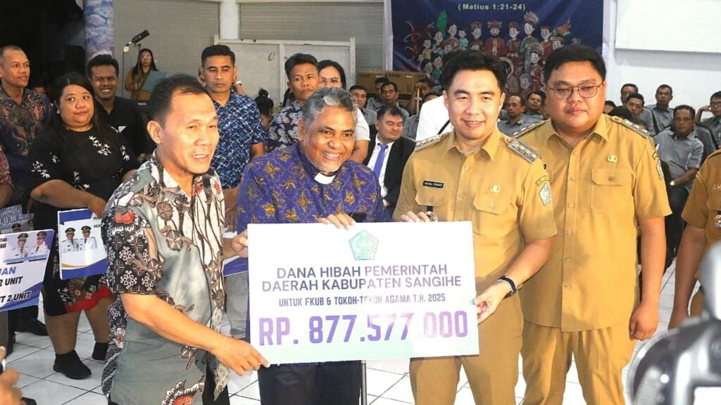 SANGIHE, bintangnusautara com– Berlangsung khusuk Ibadah Natal Oikumene Pemkab Sangihe, sekalian perhatian Pemerintah Provinsi Sulawesi Utara dan Pemerintah Daerah Kabupaten Kepulauan Sangihe , terhadap masyarakat termasuk atlet yang meraih medali di Porprov menerima bonus juga bantuan dari pemerintah Daerah juga bantuan dari Pemerintah Provinsi. Kegiatan di pusatkan di ruang papanuhung Santiago,  Senin (8/12/2025).