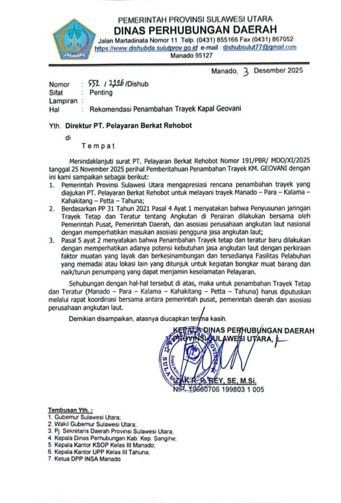 Ia menjelaskan, berdasarkan informasi terakhir, operator KM Geovani masih menunggu jadwal rapat bersama sesuai surat dari Dinas Perhubungan Provinsi Sulawesi Utara. Padahal, Pemerintah Daerah Sangihe dan Sitaro telah mengeluarkan rekomendasi, serta mendapat dukungan dari Asosiasi Perusahaan Pelayaran Nasional Indonesia (INSA) yang menyatakan tidak keberatan.