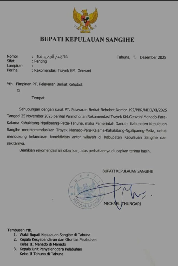 “Bupati Kepulauan Sangihe Michael Thungari sangat peduli tentang pelayanan publik dan telah mengantisipasi lonjakan penumpang Natal dan Tahun Baru dengan mengeluarkan rekomendasi izin operasional KM Geovani untuk melayani rute Manado–Petta. Namun hingga saat ini pelayaran tersebut belum terealisasi,” ungkap Fentje.